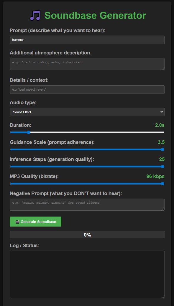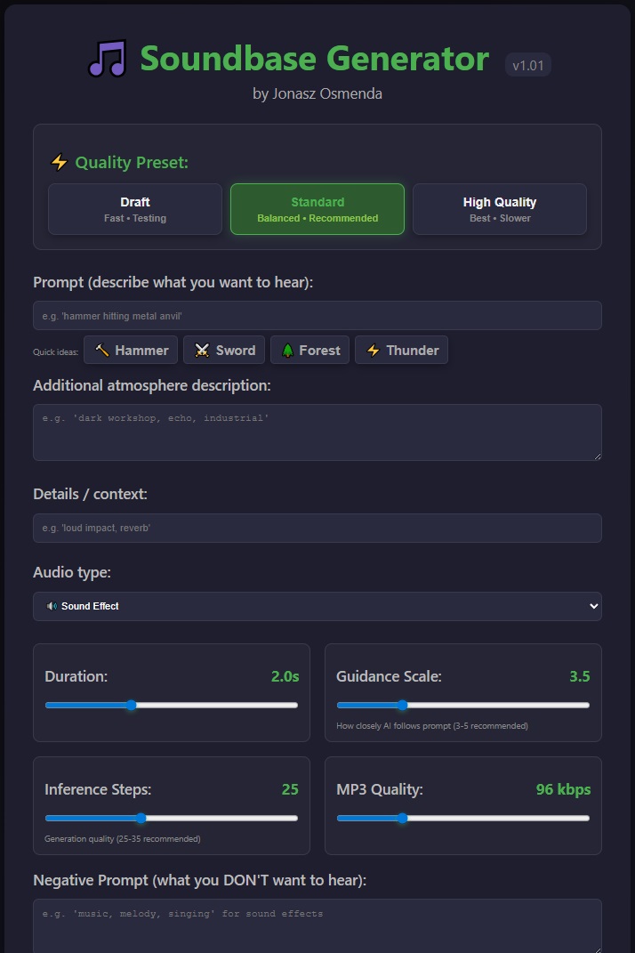 Simply describe what you want to hear: "hammer hitting metal anvil", "dark forest atmosphere with wind", "epic battle drums" - and get professional-quality audio instantly.