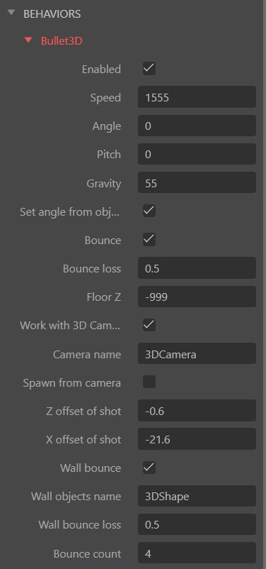 Work with 3D Camera— automatically reads angle and pitch from Construct's native 3D CameraSpawn from camera— bullet spawns at exact camera position- Wall bounce off 3D shapes with automatic normal calculation