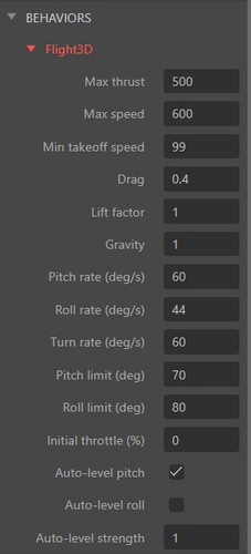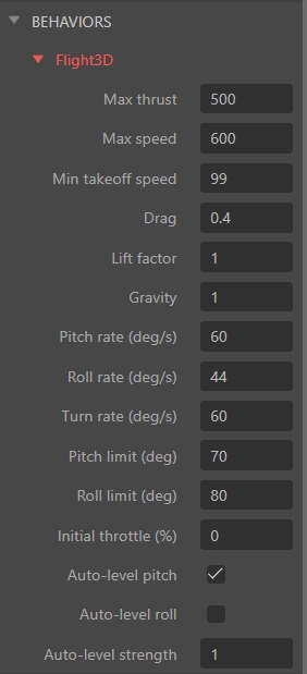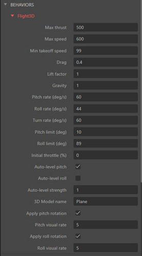 OnTakeoff,OnLand— fire once at the moment of takeoff or landing. - Tune Lift Factor and Gravity to adjust how easily the plane climbs.