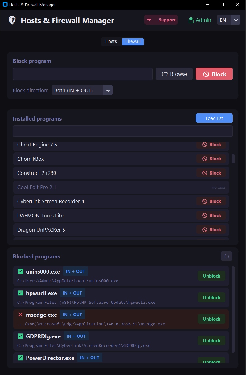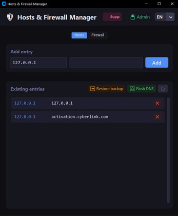 Hosts & Firewall Manager is a clean, modern desktop tool that lets you manage your Windows hosts file and firewall rules with just a few clicks. No command line, no registry digging, no guesswork.