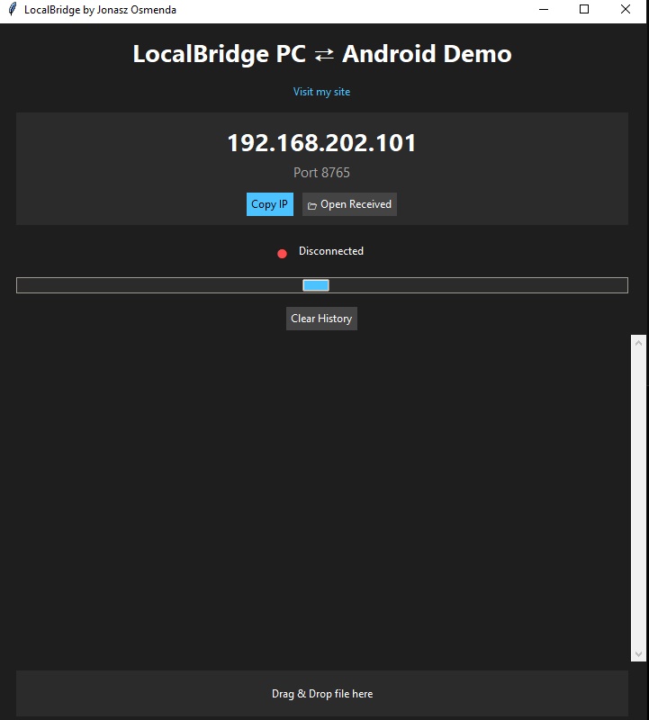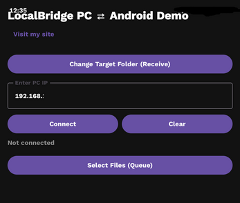 LocalBridge is a lightweight, fast and private file transfer tool that connects your Windows PC and Android phone over your local Wi-Fi network. Drag a file onto the PC app, and it lands on your Android in seconds. Send files from your phone back to your PC just as easily.