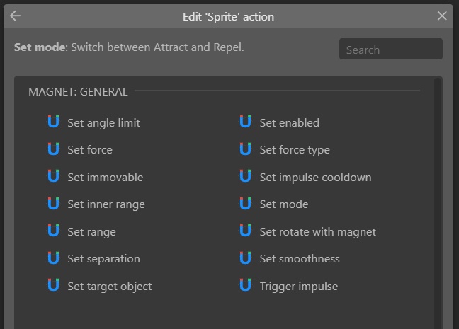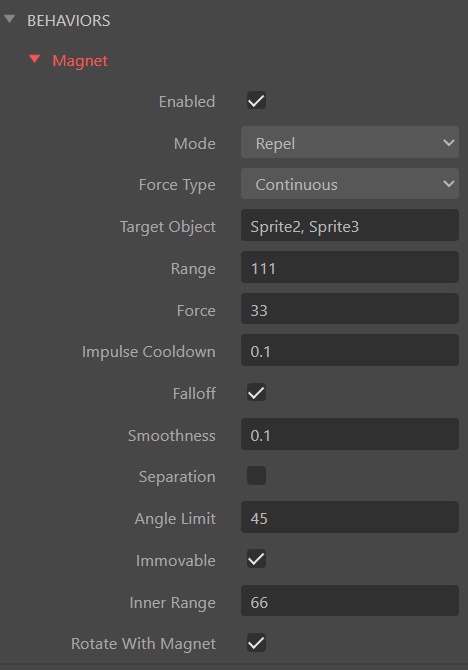 - Angle Limit — restrict the magnet's influence to a cone in front of the sprite